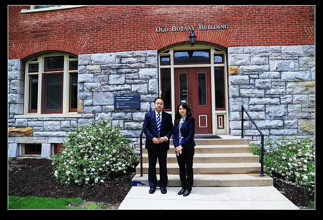 图8 王校长在宾州州立大学孔子学院门前与牛晓春院长合影留念