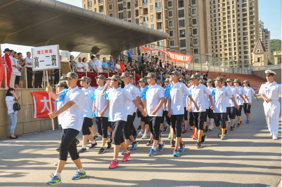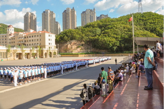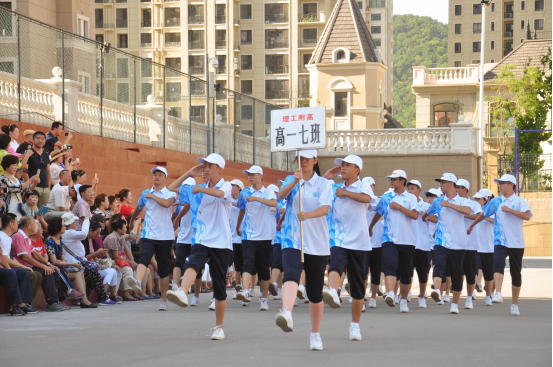 王跃进校长在91550部队两位首长陪同下,检阅班级队列方阵。王校长走到每个受检方阵前伸出大拇指并高喊:同学们辛苦了!每个受检方阵同学以“为人民服务”“为学校争光”高亢、响亮的口号进行回答,一时间,群山回应,响遏晴空白云。