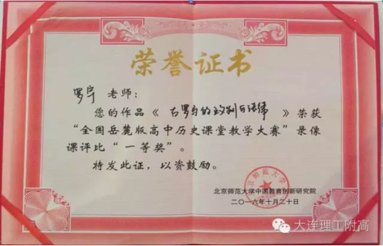 大赛分为现场展示课大赛和录像课大赛两项,大连市共有两位老师代表辽宁省参加两项比赛,历经激烈角逐和评委老师耐心、公平、认真的评选,我校罗宇老师《古罗马的政制与法律》一课脱颖而出,荣获录像课大赛一等奖。